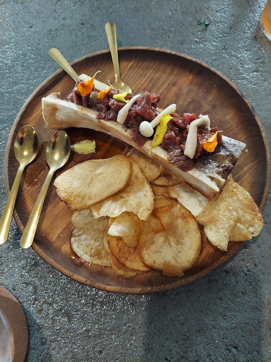 Noka offers an unparalleled ambiance with thoughtfully designed interiors featuring raw wood, stones, and antique vases, creating a natural and inviting atmosphere. The family-style seating adds to the unique experience, with concrete tables adding to the beauty. We visited early and enjoyed the privacy, as we didn't have anyone seated next to us. Cocktails were a highlight, creatively presented and delicious. The dirty martini with wasabi olives stood out. However, while the truffle tuna roll impressed with its flavor, other dishes like the edamame toast were good but not exceptional. The sweet potato jewels were unique and tasty, but the Kung Pao Brussels sprouts lacked the wow factor. Though the overall experience and ambiance warrant a five-star rating, the food falls slightly short, making it more of a four-star experience. While I'd return for cocktails and perhaps an appetizer, the prices felt steep for the quality offered.