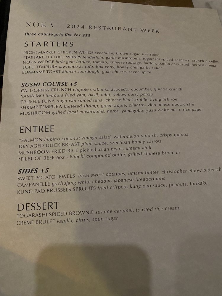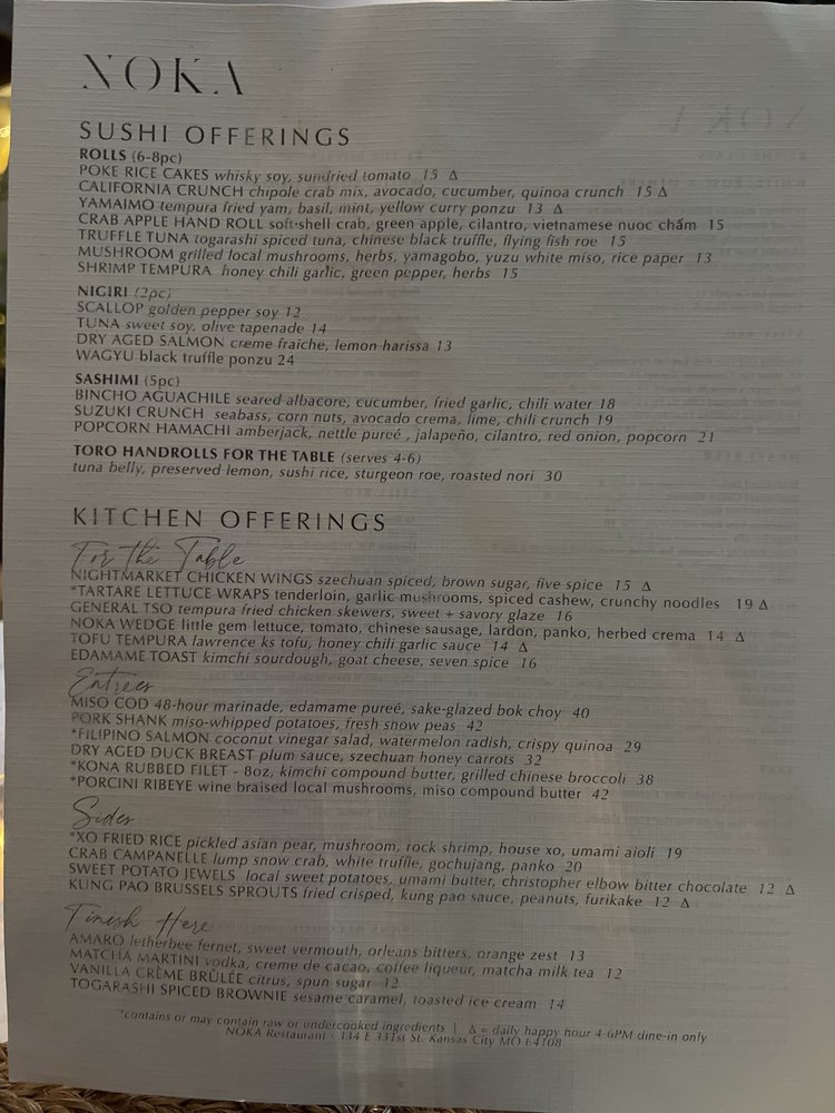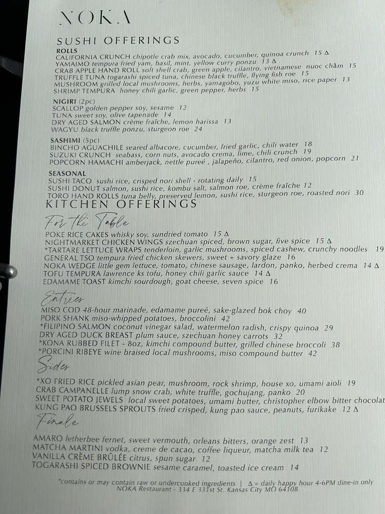 Noka is a trendy and intimate restaurant in Kansas City offering a fusion of New American and Japanese cuisine. Customers rave about the high-quality food, refreshing mocktails, and fantastic service. The atmosphere is described as rustic yet elegant, with communal seating adding to the lively and cozy vibe. Standout dishes include the Shrimp Tempura roll, Tofu Tempura, Tartare lettuce wraps, Miso cod, and Filipino salmon. The unique flavors and creative presentations make each dish a flavor bomb. While some dishes like the Kung Pao Brussels sprouts may lack the wow factor, the overall experience at Noka is top-notch. The modern ambiance, delicious food, and inviting atmosphere make it a must-visit spot for a memorable dining experience.